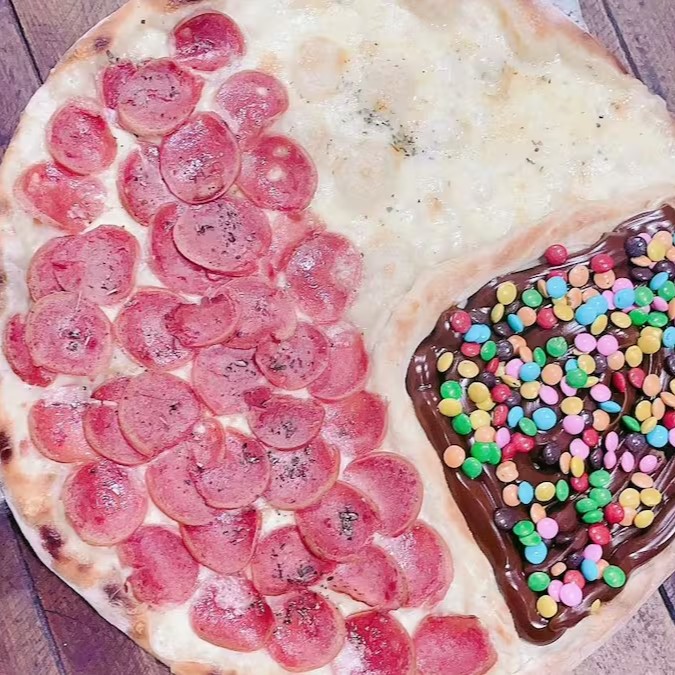 4 fatias de calabresa, 2 fatias de mussarela e 2 fatias de chocolate.