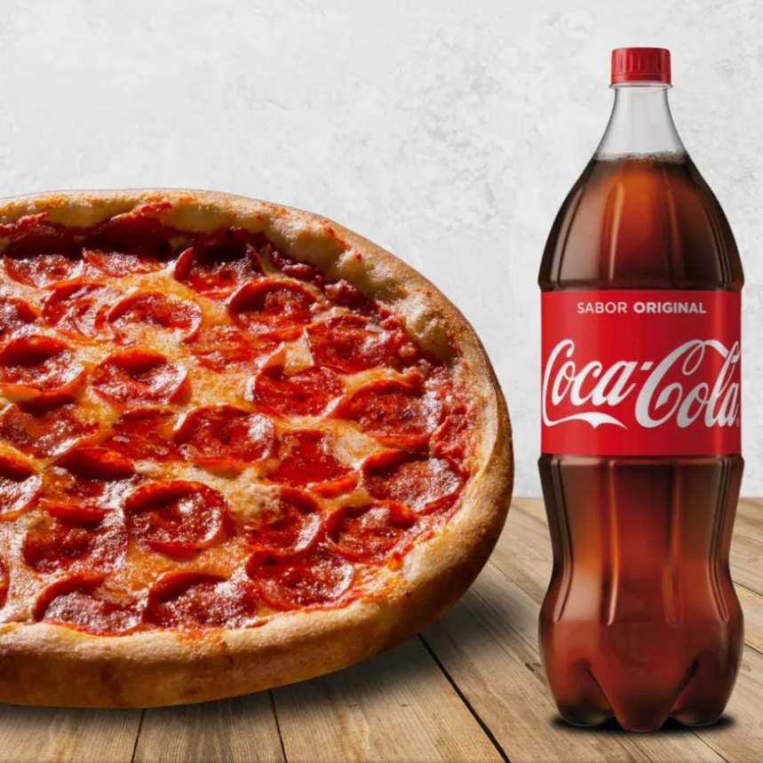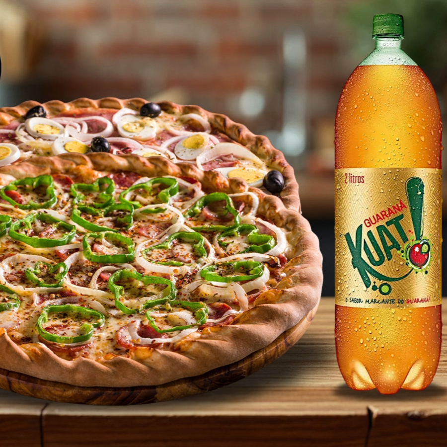 Uma pizza à moda cheia de sabores e uma calabresa suculenta, ambas com 8 fatias, acompanhadas de um Kuat 2l para deixar sua refeição ainda mais especial!