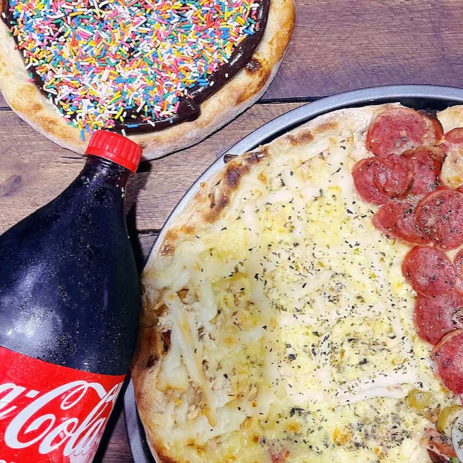 Pizza Gg 35cm 8 fatias: 2 fatias de calabresa, 2 fatias de frango Catupiry, 2 fatias de presunto e 2 fatias de à modaPizza broto 20cm 4 fatias: mussarela, chocolate e granulados coloridos + kuat 2l