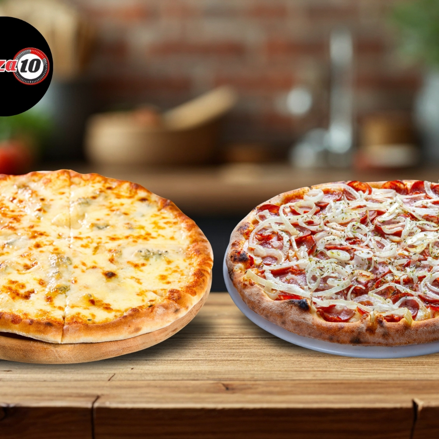 Pizza de Muçarela derretida e pizza de calabresa suculenta, ambas com 8 fatias, perfeitas para quem ama sabores clássicos e irresistíveis!