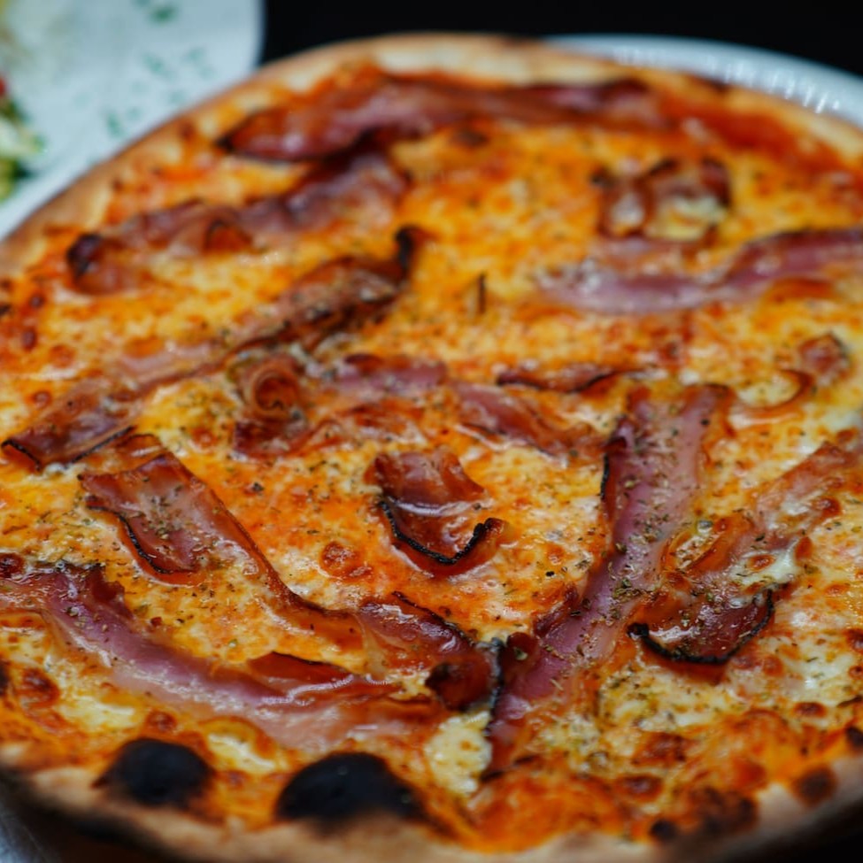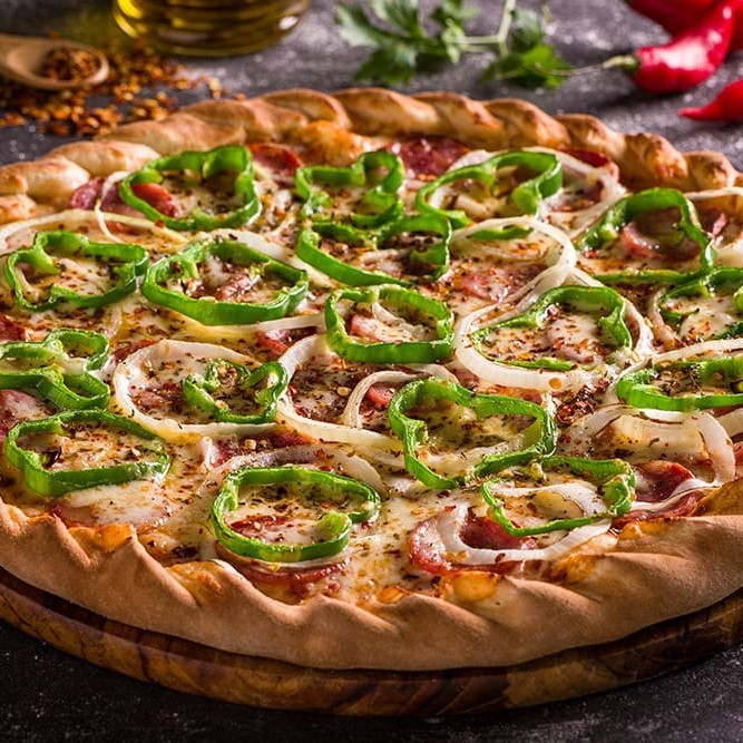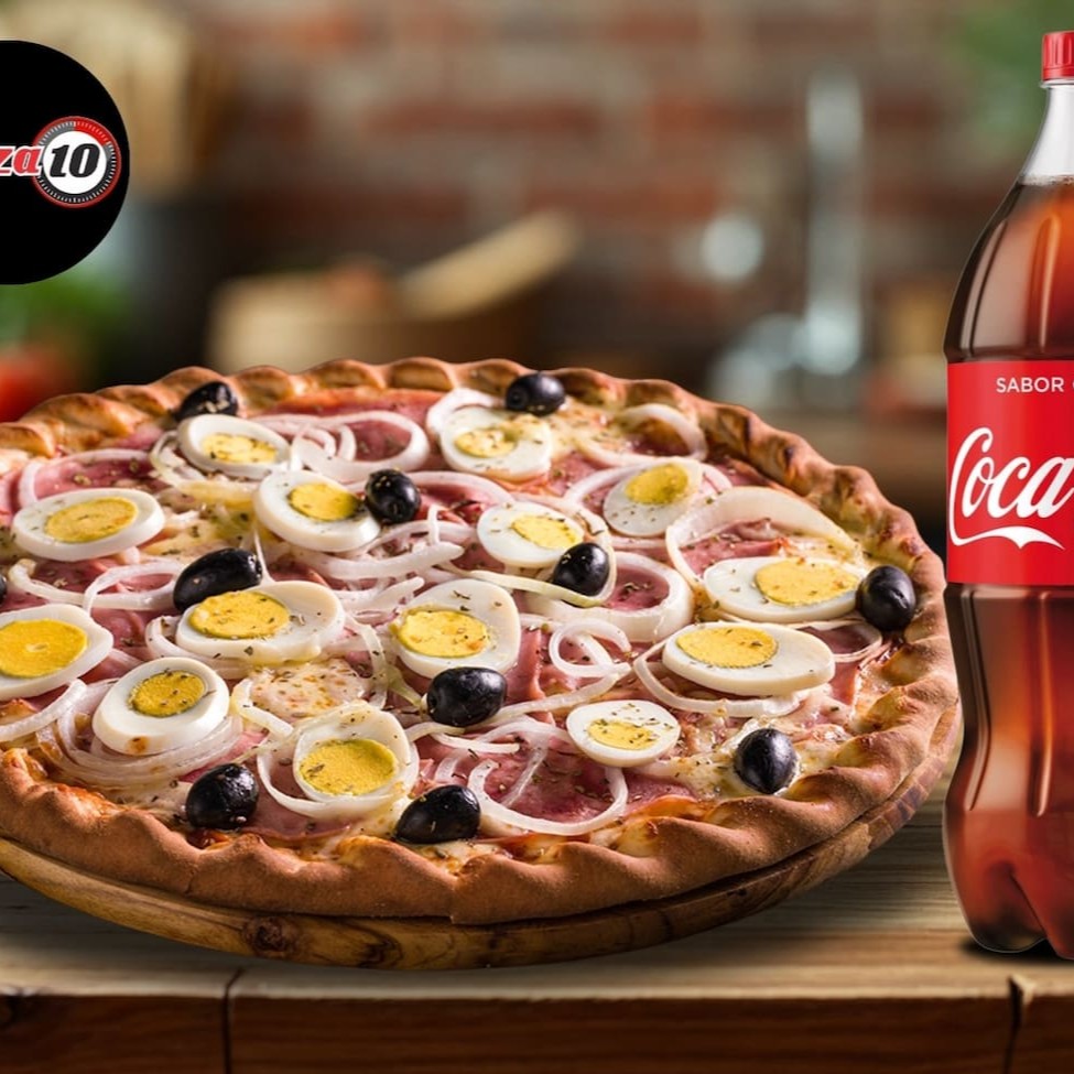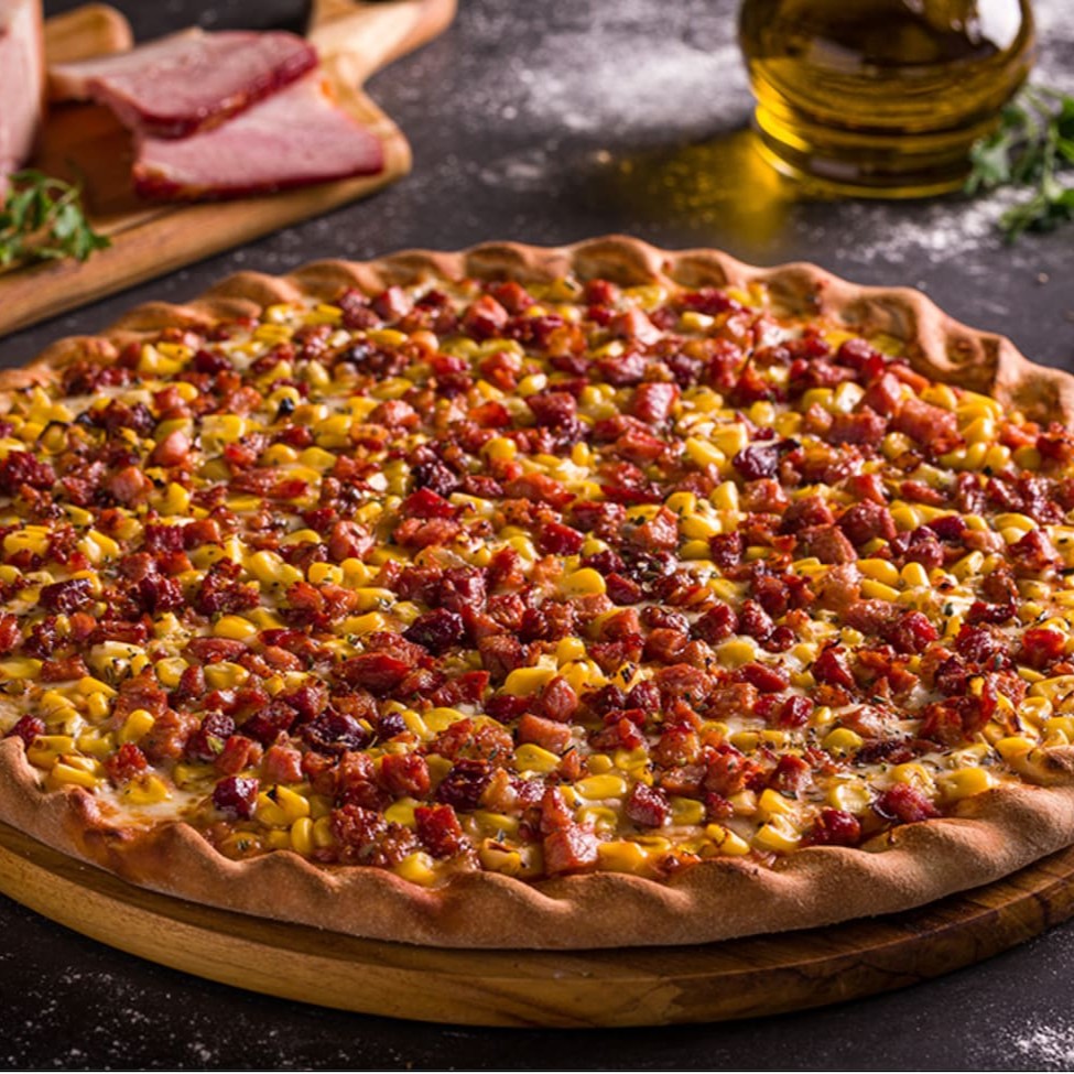 Pizza gigante de 8 fatias, Mussarela derretida, presunto macio, calabresa picante, azeitonas, bacon crocante, cebola e ovo fresquinho. Uma pizza recheada de sabores marcantes e irresistíveis!