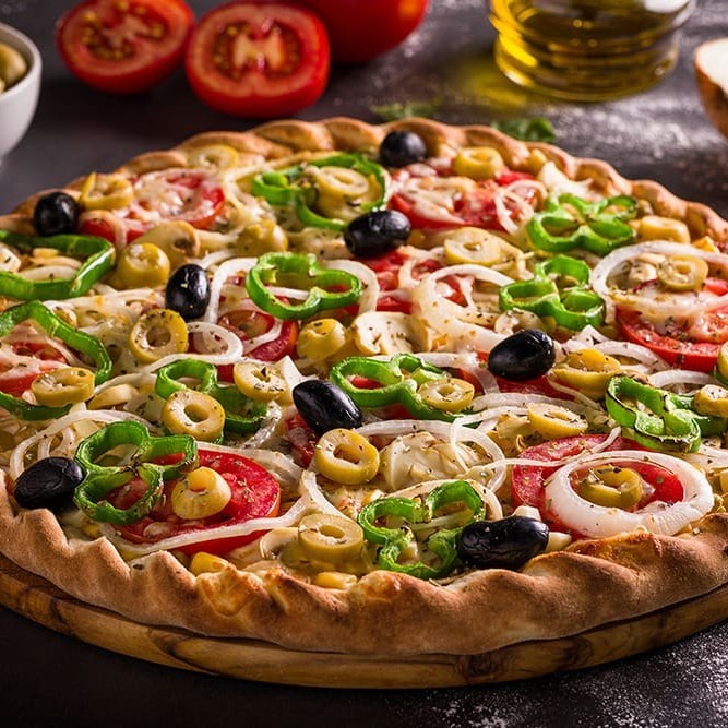 Massa leve e crocante, com molho de tomate suave, mussarela derretida e uma explosão de sabores: tomate fresco, cebola, pimentão, azeitonas verdes, palmito, milho e orégano.
