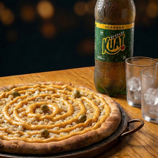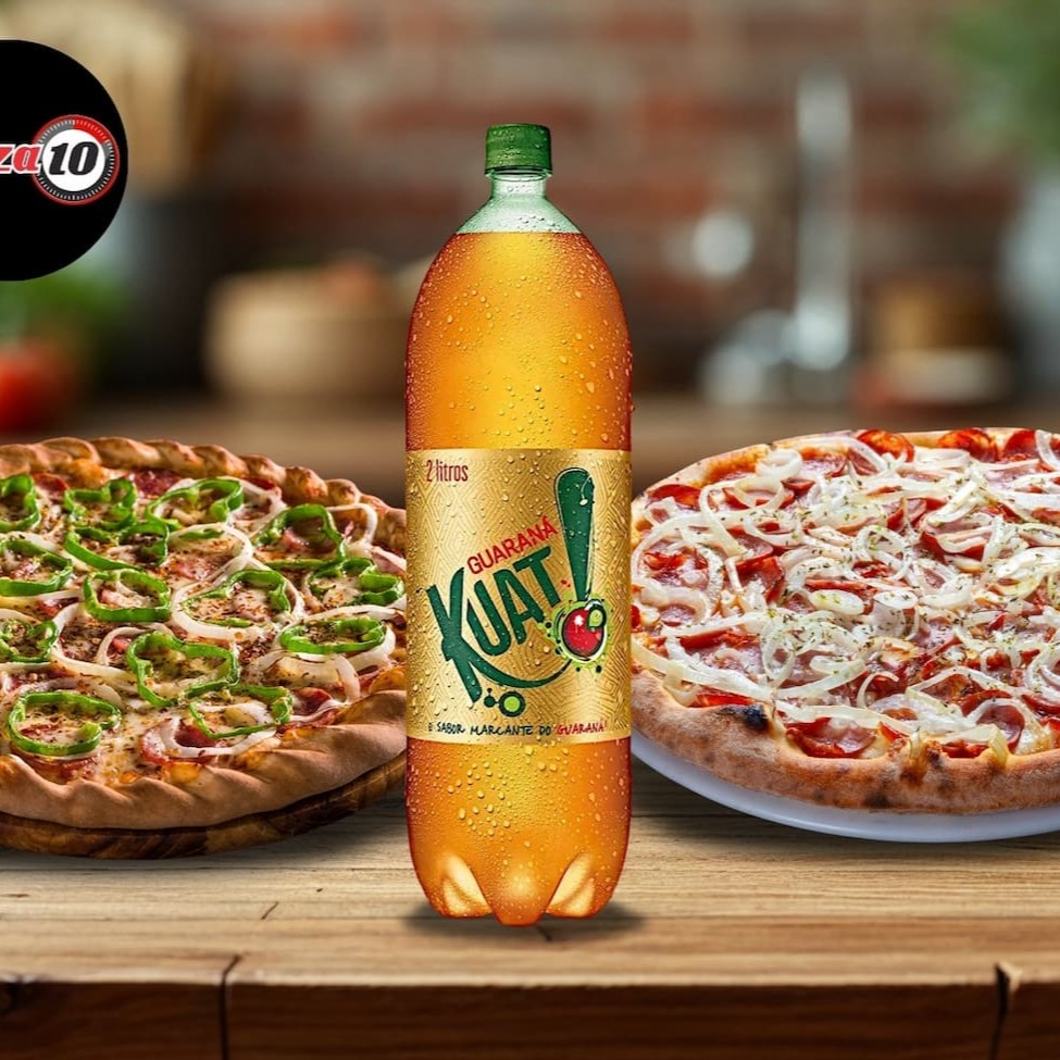 Duas pizzas gigantes irresistíveis para dividir momentos incríveis, acompanhadas de um Kuat geladinho de 2l para completar a festa!