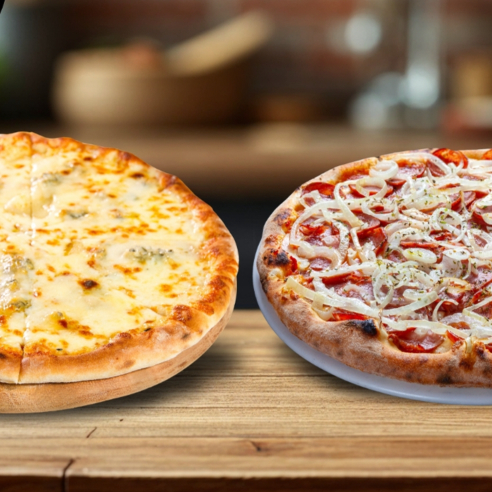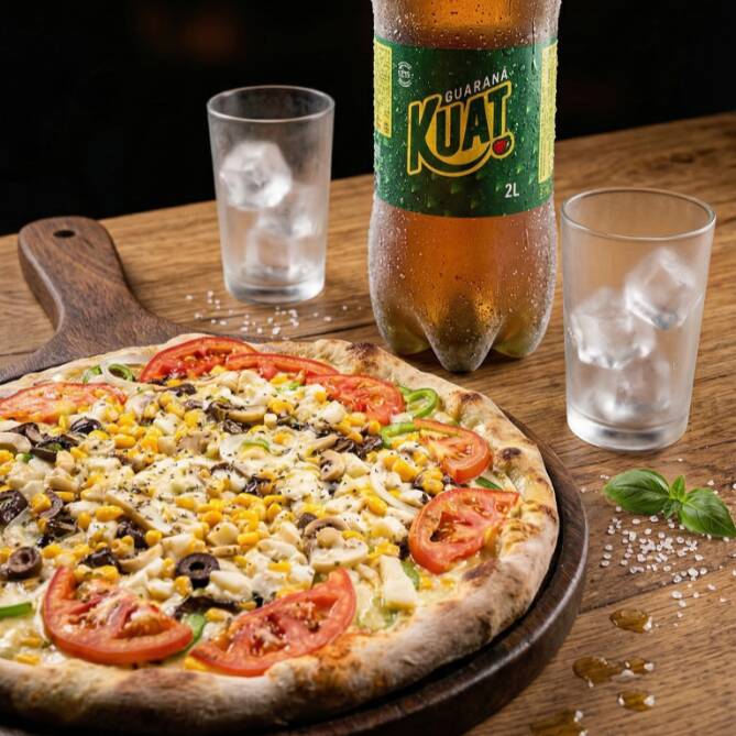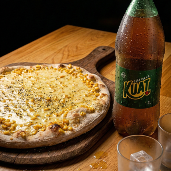 Promoção incrível: 2 pizzas gigantes, com 8 fatias cada, recheadas com os melhores sabores, acompanhadas de Kuat 2l. A combinação perfeita para compartilhar momentos deliciosos!