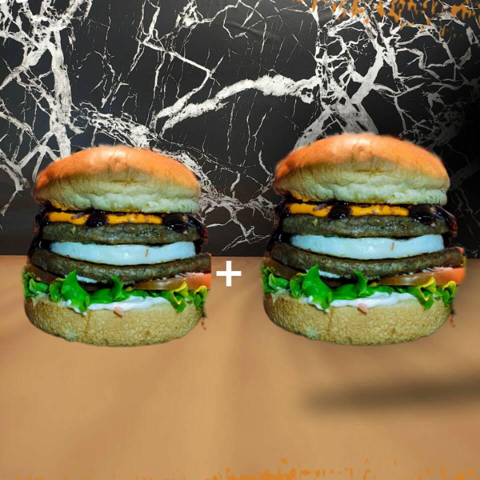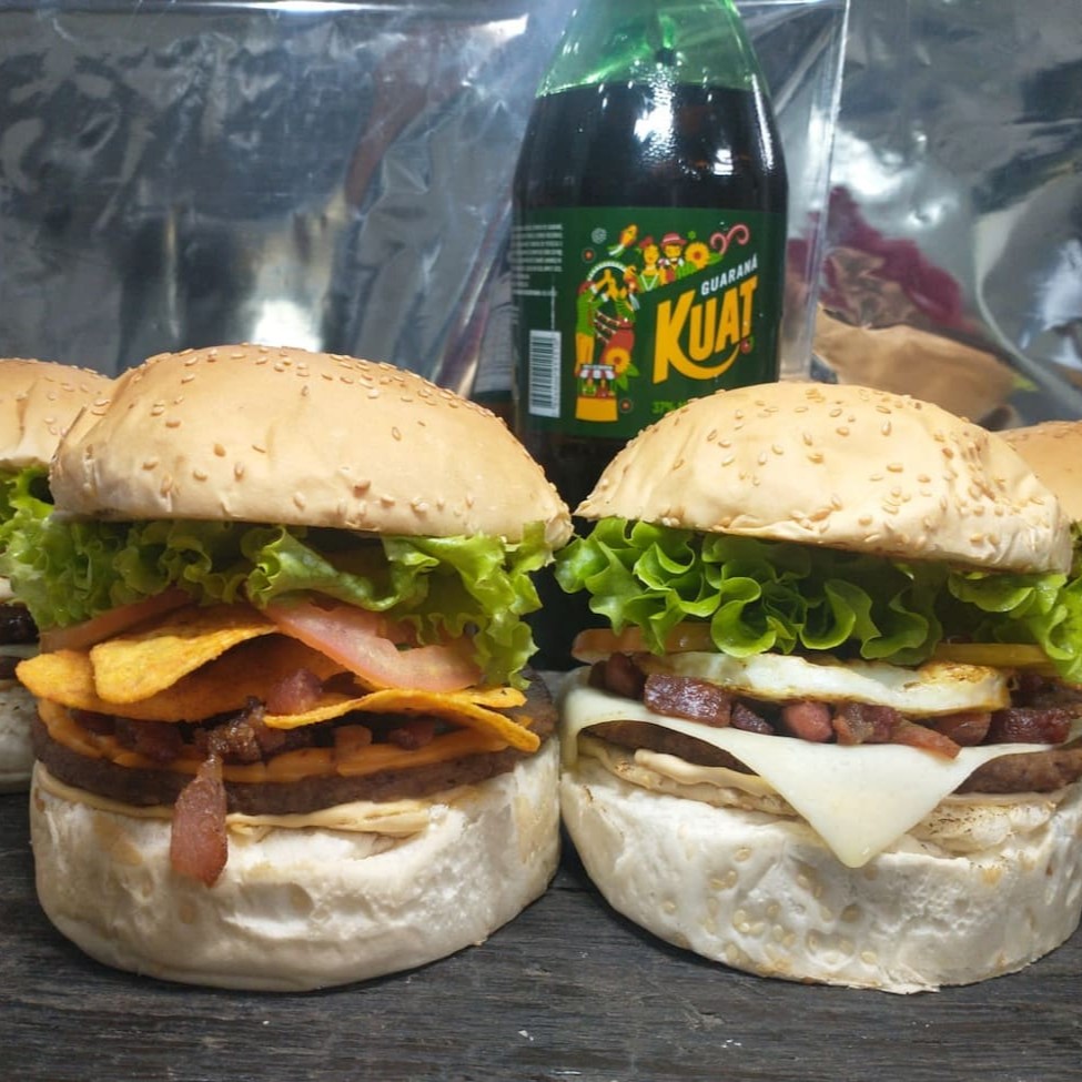 2 Hamburguer pao brioche 2 carnes ovo molho defumado cheddar farofa de bacon alface e tomate e molho barbecue