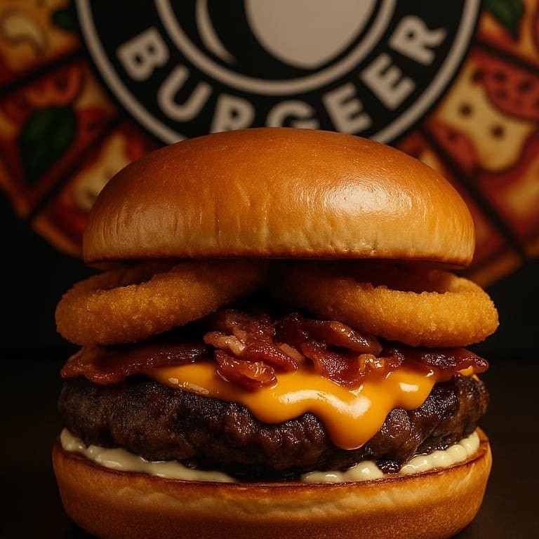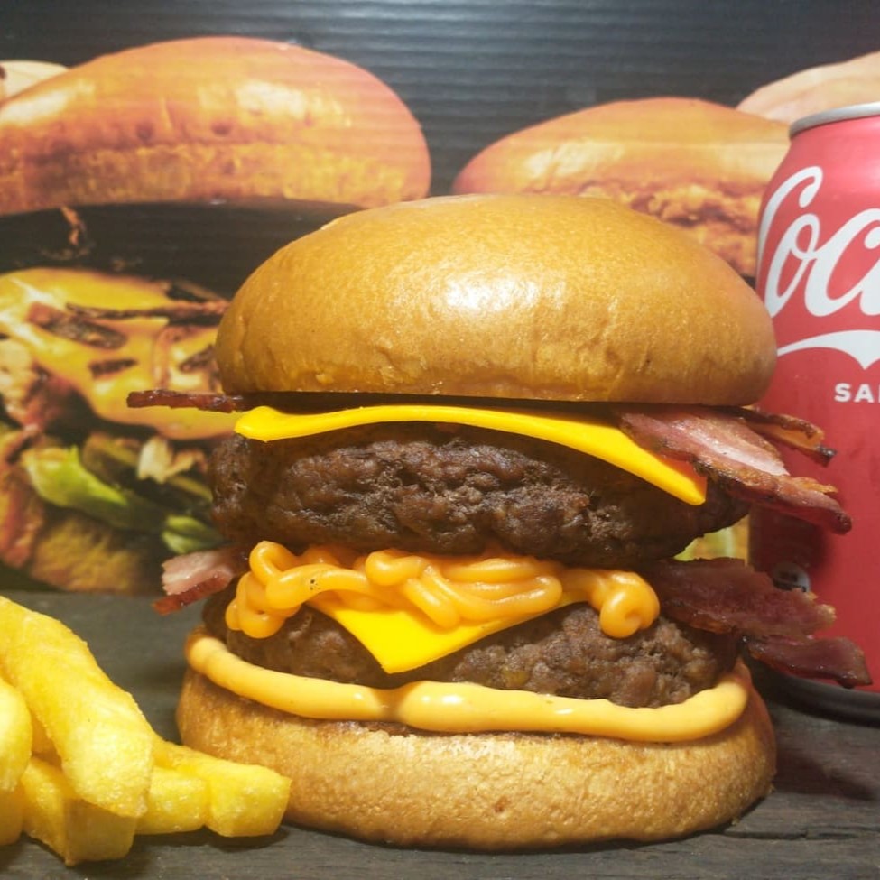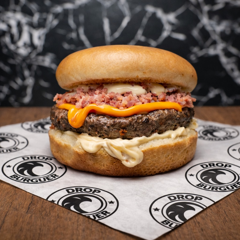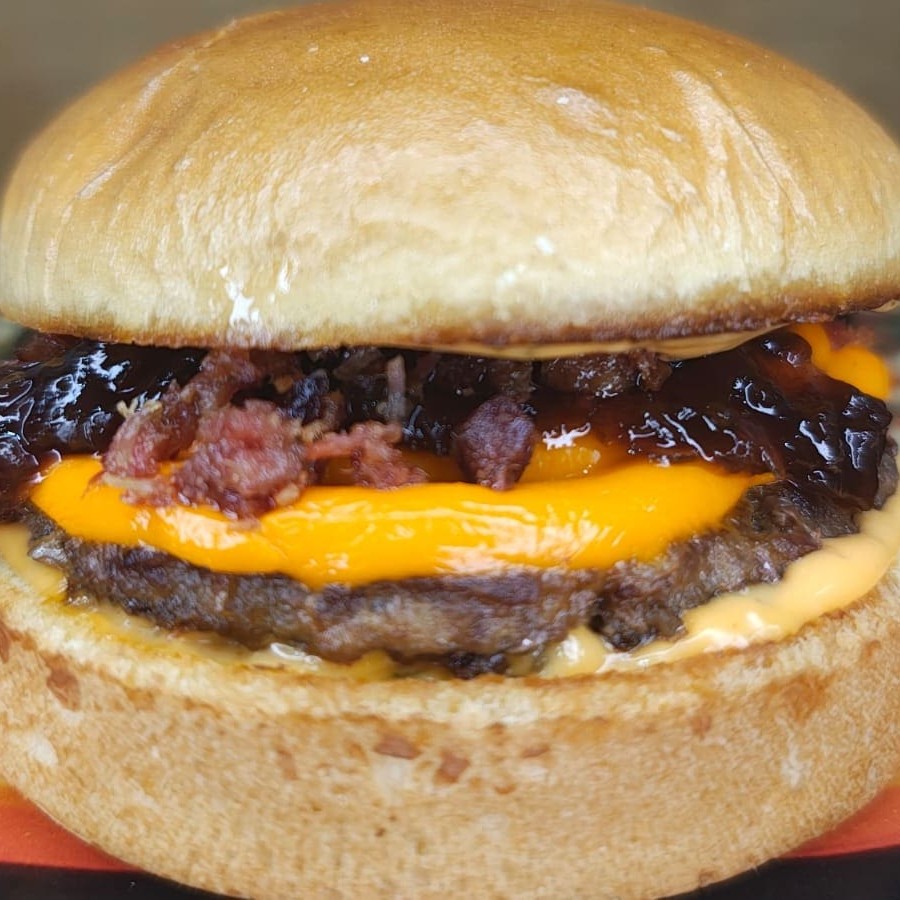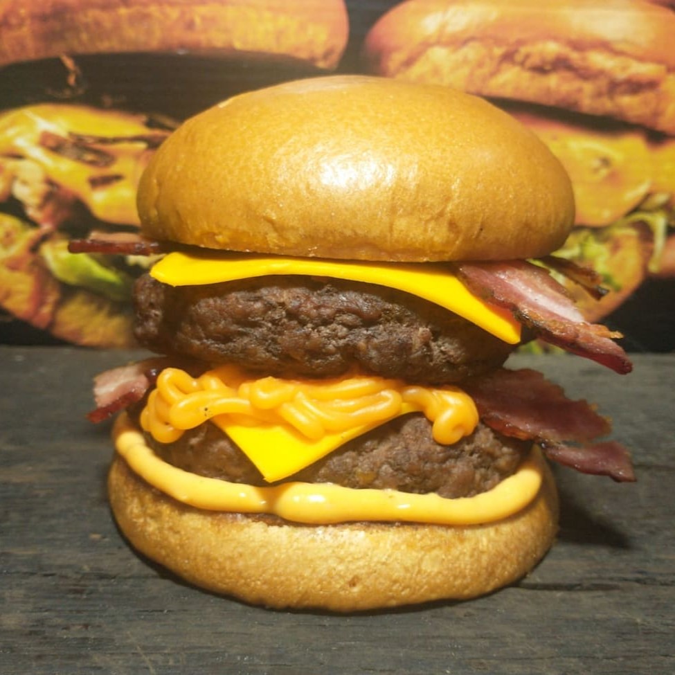 Pão de brioche tostado na manteiga, 2 blend artesanal bovina , queijo cheddar fatiado, bacon duplo fatiado, molho americano e molho especial