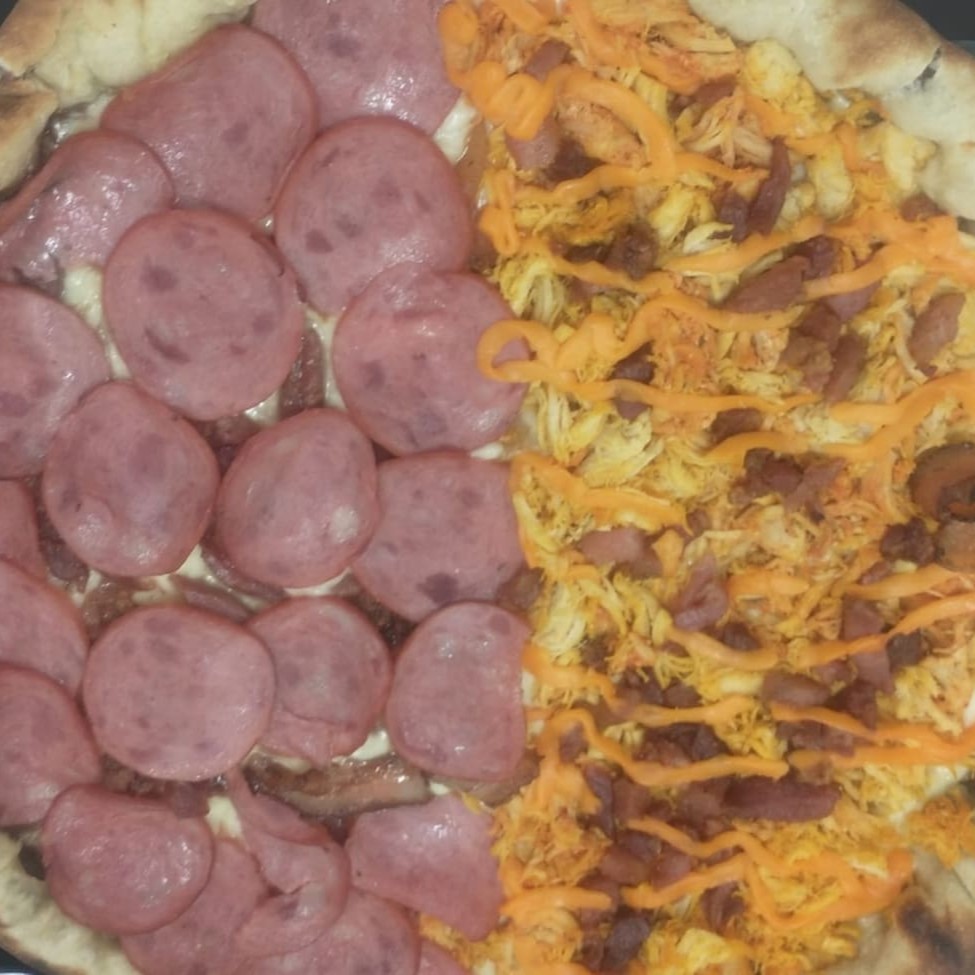 Pizza Meio Calabresa Meio Frango Bacon E Cheddar Com Borda Gratis