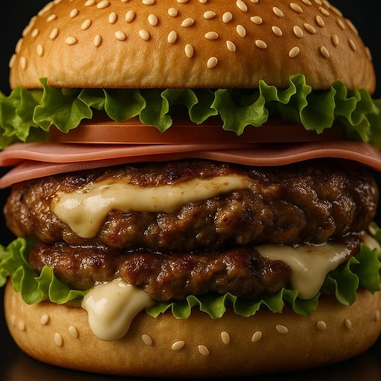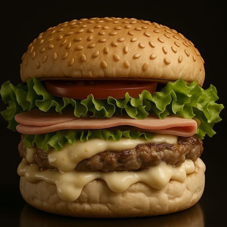 Pão 2 Carnes De Hamburguer , Mussarela ,Presunto, Molho Especial Alface Tomate.(Batata E Refri E A Parte , Nao Vem Batata E Nem Refrigerante E A Parte)