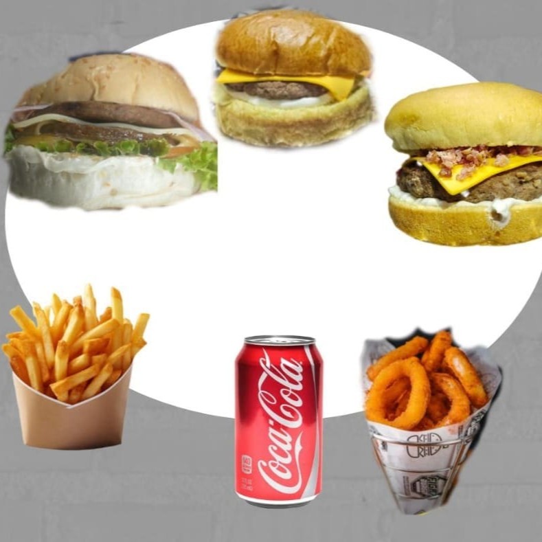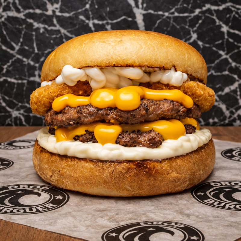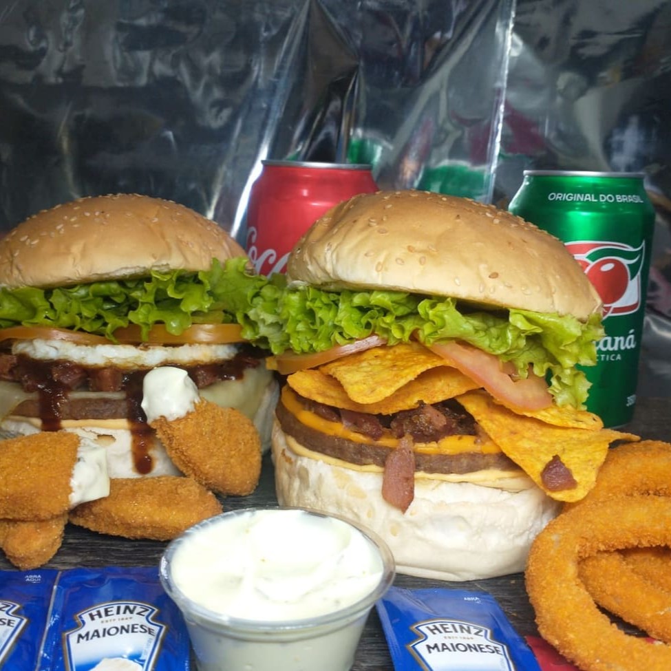 PÃO BRIOCHE CHAPEADO, 2 CARNES ARTESANAL, MOLHO DEFUMADO, CHEDDAR CREME, CEBOLA EMPANADA, CATUPIRY PARA FINALIZAR.