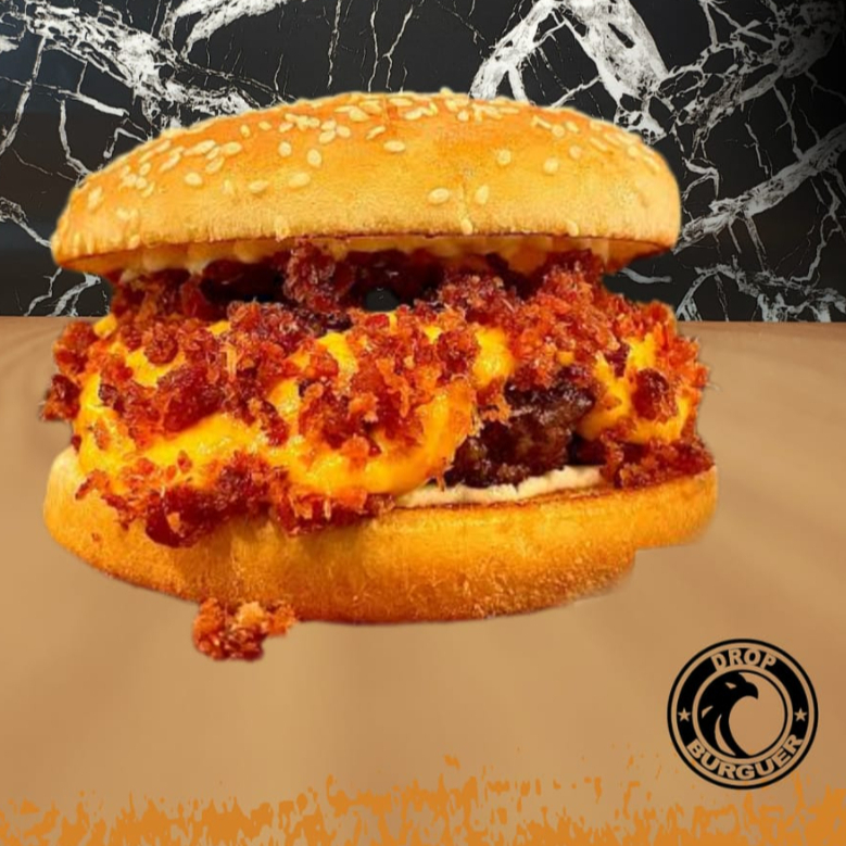 Pão com gergelim, carne smash, molho chimichurri, cheddar creme, farofa de baconn.