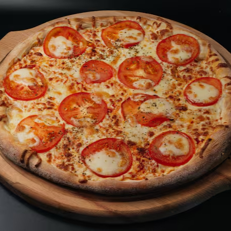 À Moda - Mussarela derretida coberta com calabresa fatiada, presunto suculento, bacon crocante, milho doce, pimentão colorido, cebola dourada e tomate fresco, finalizada com molho especial da casa.