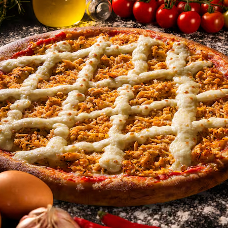 Frango - Pizza irresistível com mussarela derretida, frango suculento, Catupiry cremoso e um toque especial de molho e orégano.