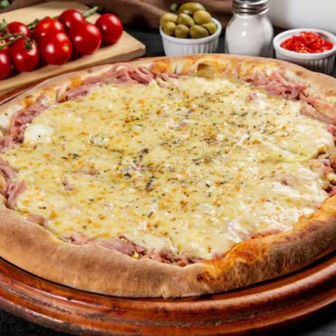 Presunto - Pizza saborosa com mussarela derretida, presunto delicado, molho especial e um toque de orégano.