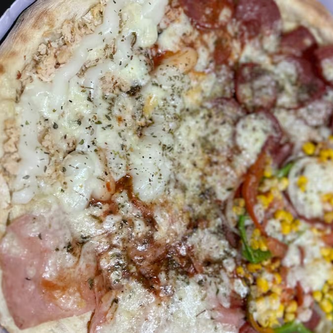 Mussarela derretida coberta com calabresa fatiada, presunto suculento, bacon crocante, milho, pimentão, cebola e tomate, finalizada com molho especial da casa e orégano.