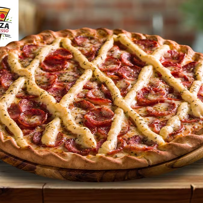 À Moda - Mussarela derretida coberta com calabresa fatiada, presunto suculento, bacon crocante, milho doce, pimentão colorido, cebola dourada e tomate fresco, finalizada com molho especial da casa.