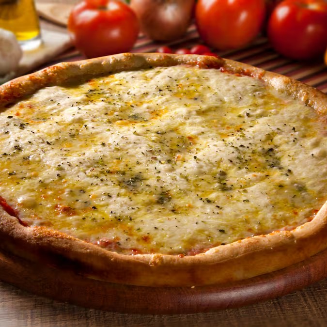 Frango - Pizza irresistível com mussarela derretida, frango suculento, Catupiry cremoso e um toque especial de molho e orégano.