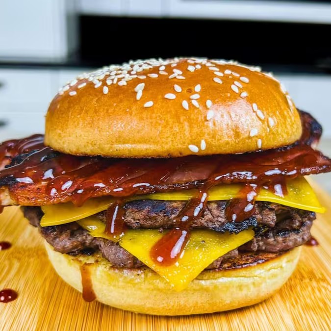 Pão de brioche , hambúrguer de boi , presunto , mussarela ,bacon , alface , tomate , milho , batata palha e molho especial