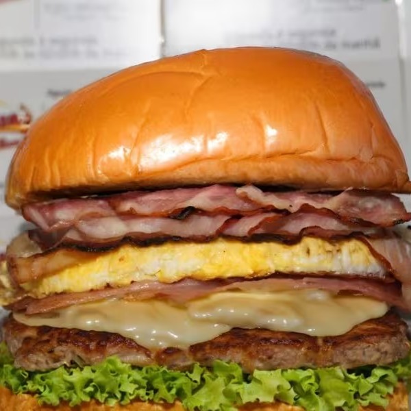 Pão de brioche , hamb De boi 90g , hamb. De frango , ovos , queijo , presunto ,bacon , Catupiry , alface , tomate , milho, batata palhaee molho especial