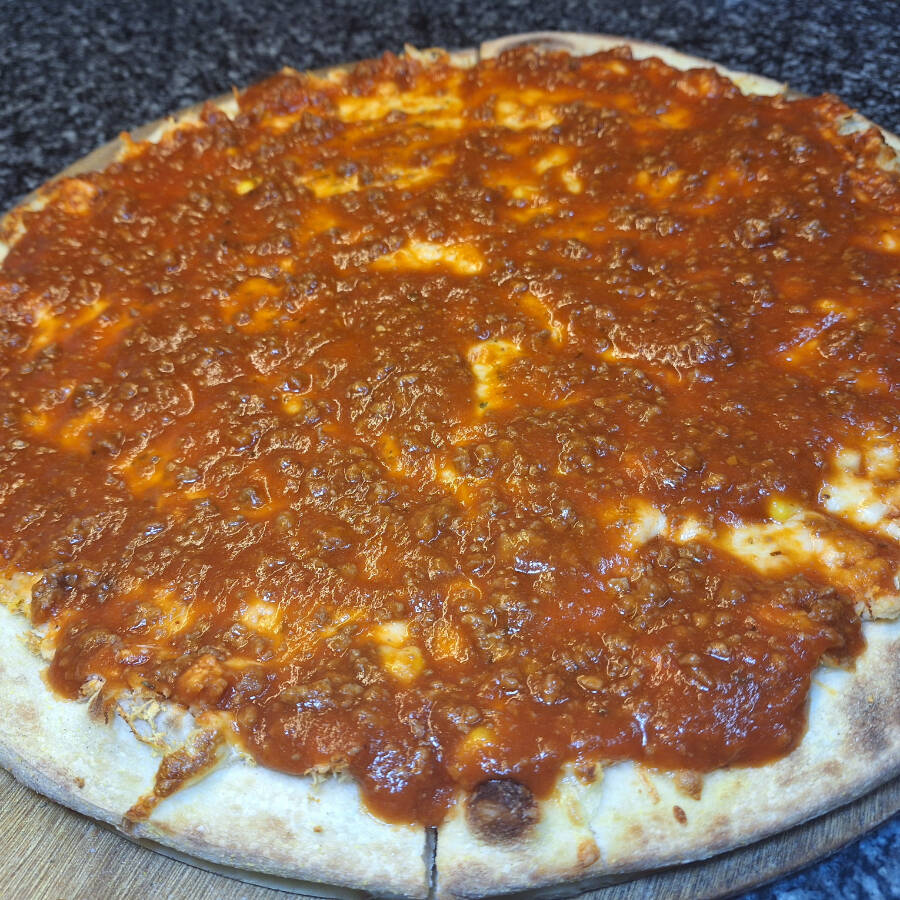 Mussarela, frango desfiado, milho e molho a bolonhesa