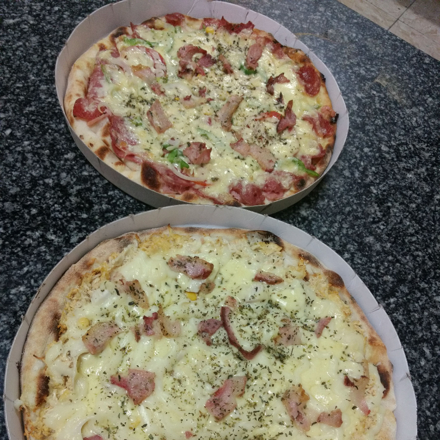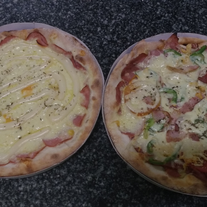 Escolha entre os sabores: a moda, calabresa, presunto, mussarela, milho, legal ou marguerita (Os sabores não podem ser alterados, * 6 fatias cada pizza)