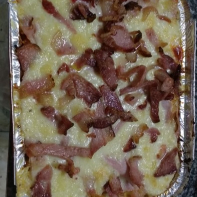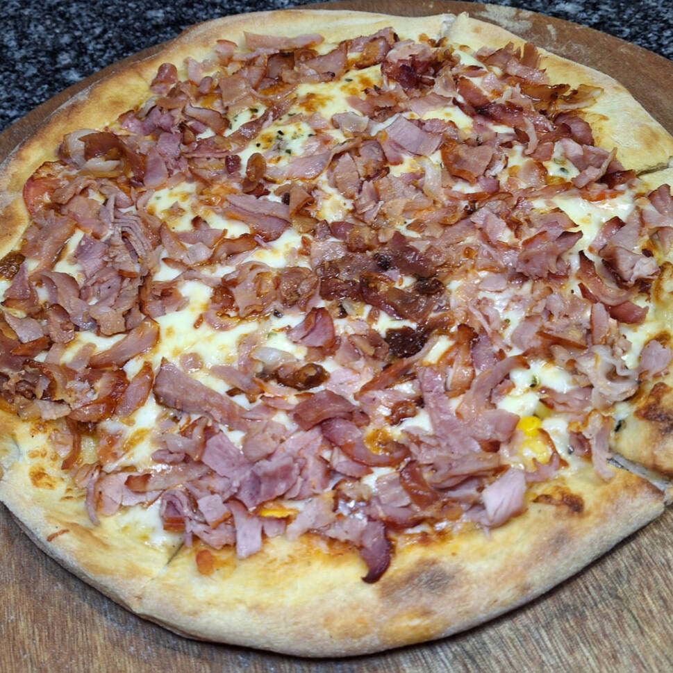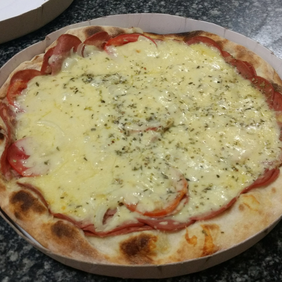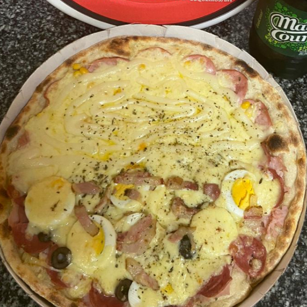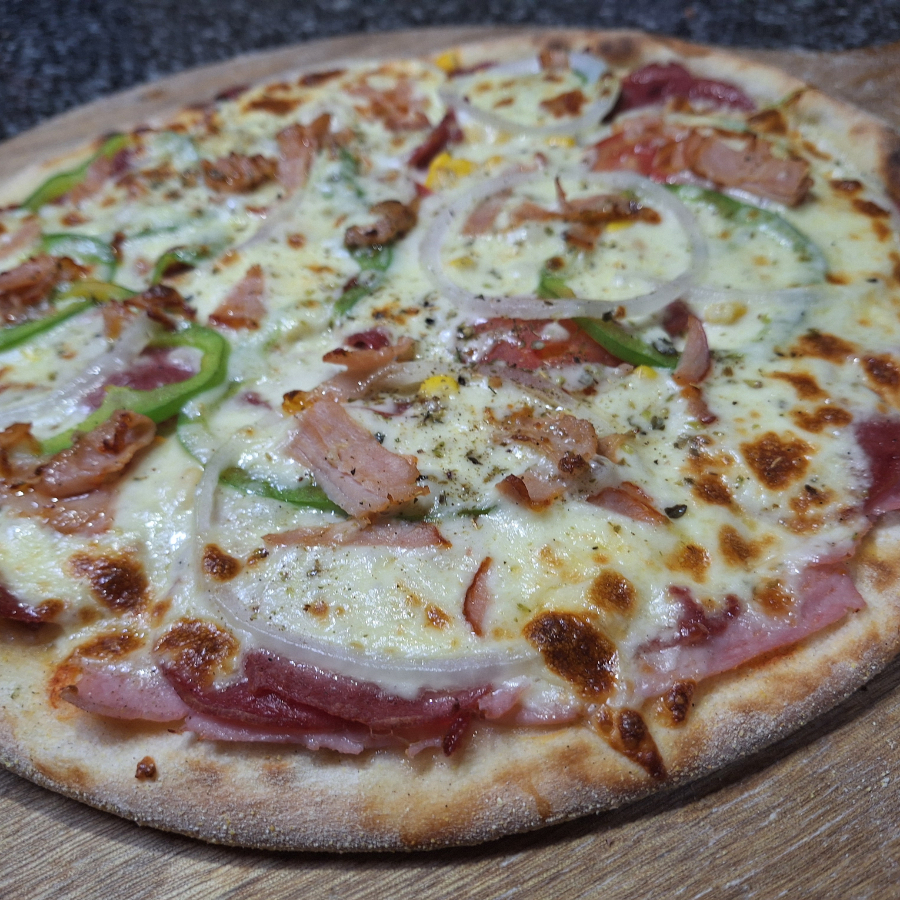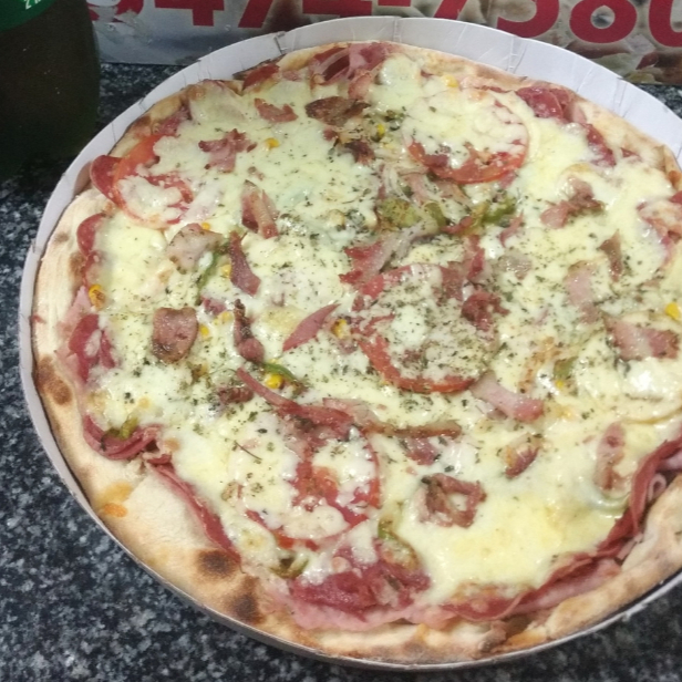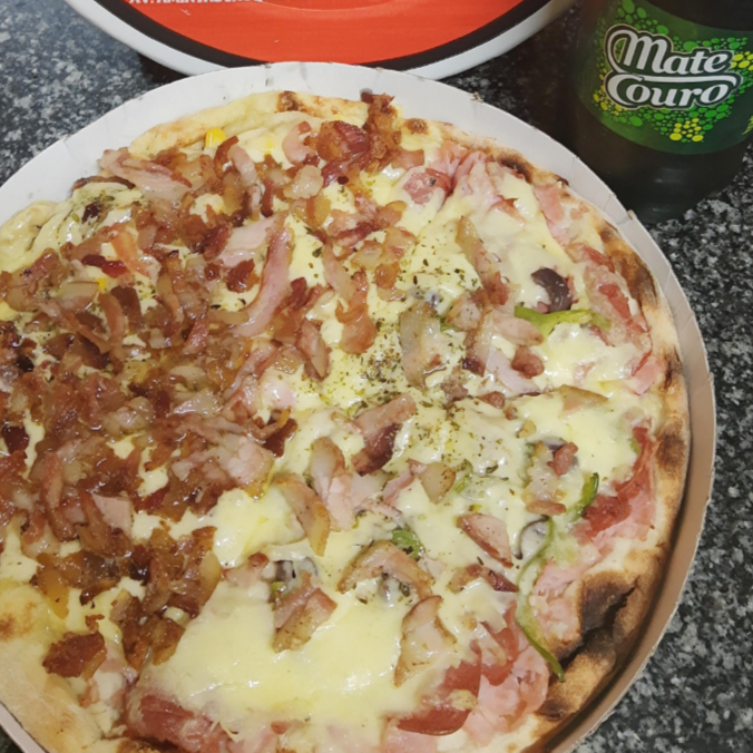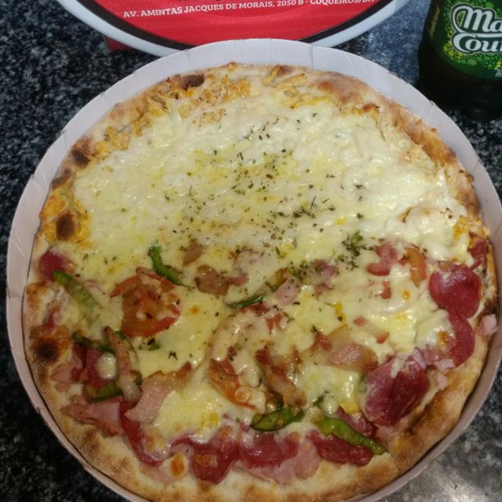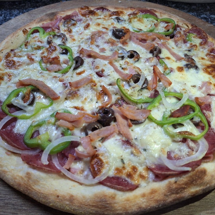 Mussarela, presunto, calabresa, azeitona preta, pimentão, cebola e bacon