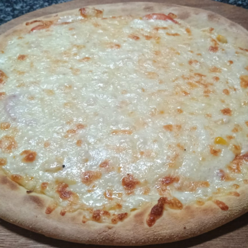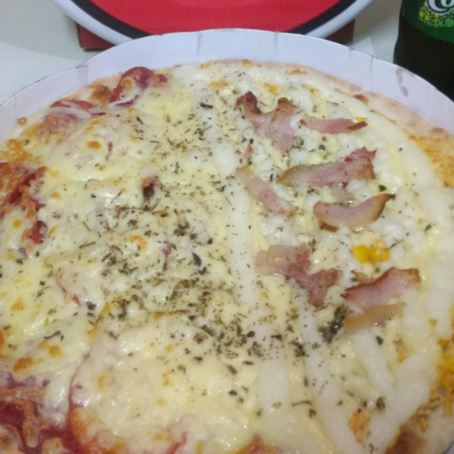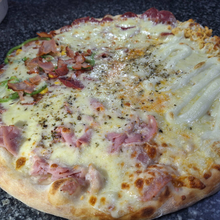 Mussarela, presunto, calabresa, milho, tomate, pimentão, cebola e bacon
