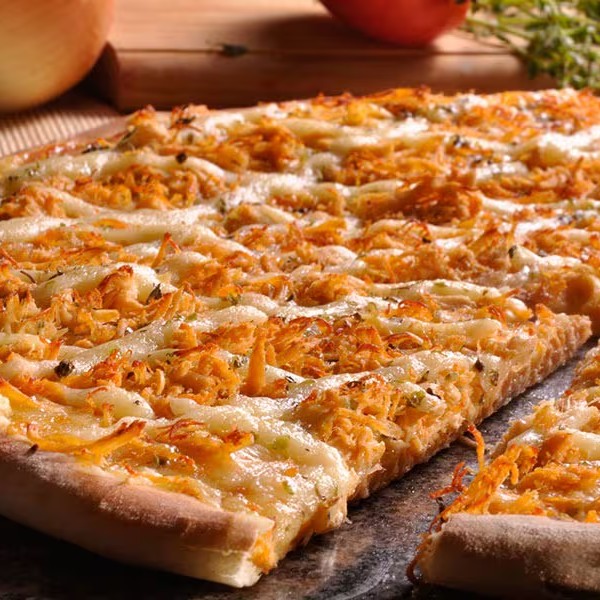 Massa de nhoque, molho branco, milho verde, Frango desfiado, Presunto, Catupiry e mussarela.