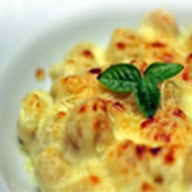 Massa de nhoque, molho branco, Parmesão, Provolone, Catupiry e mussarela.
