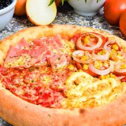 (¼ calabresa, ¼ legal, ¼ presunto , ¼ frango Catupiry). (35cm - 8 fatias)