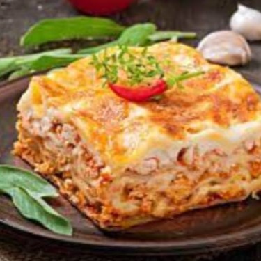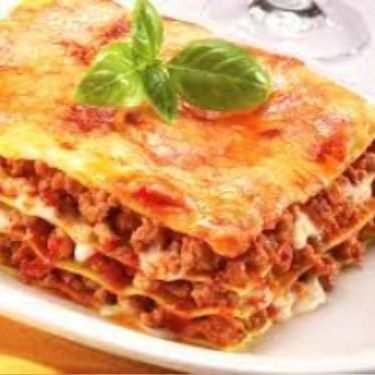 Lasanha, molho á bolonhesa, presunto e mussarela.