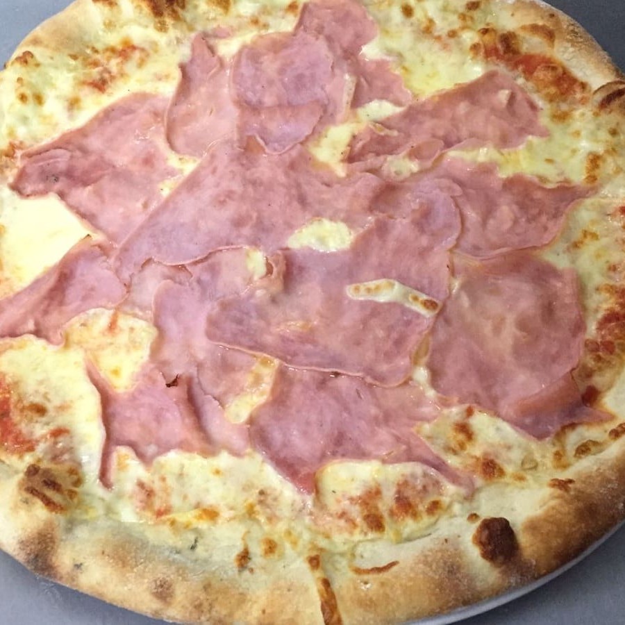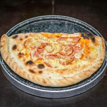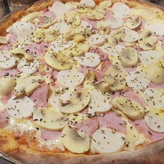 Mussarela, presunto, cheddar, milho, frango, com cobertura de calabresa, parmesão e alho.