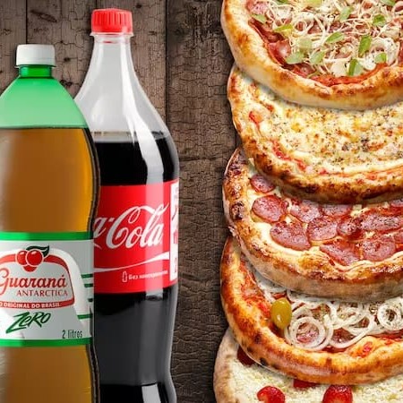 5 Pizzas Grandes de 6 fatias + 2 Refrigerantes 2 litros. Coca cola ou Guaraná antártica, escolha os sabores.