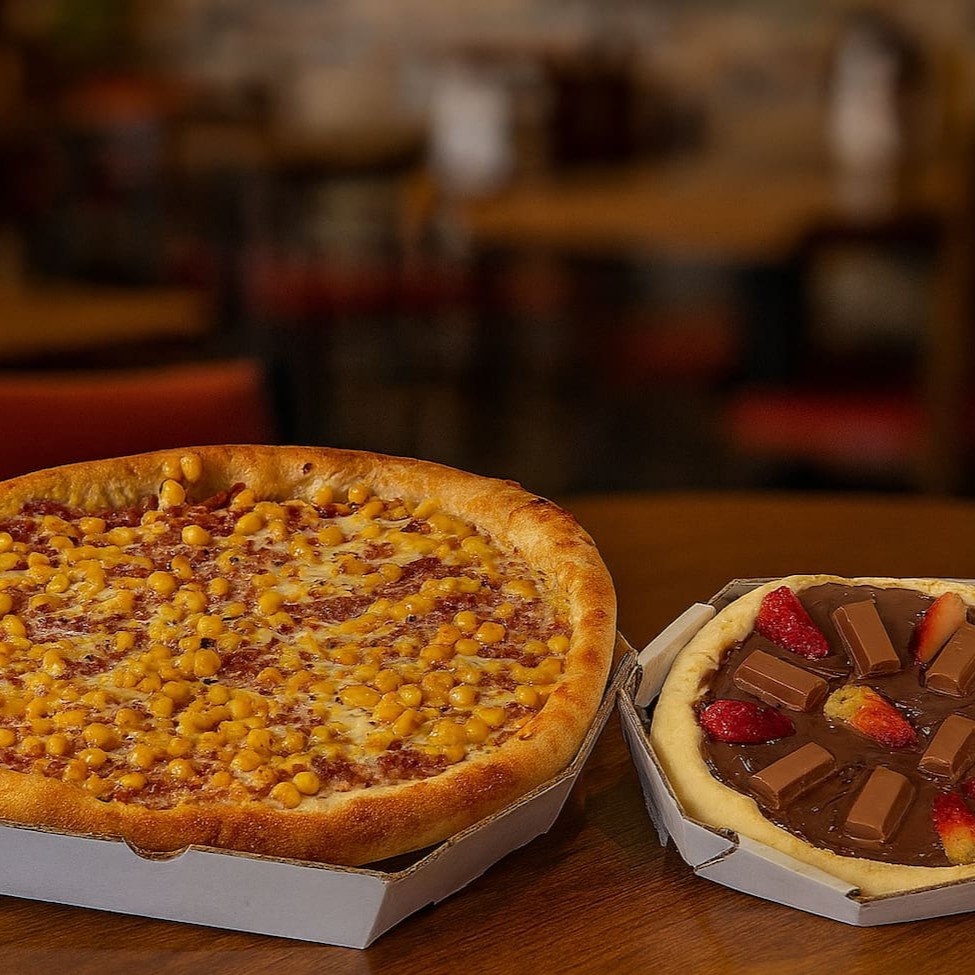 1/ Molho Mussarrela Presunto Calabressa Tomate Cebola Pimentao Milho Azeitona Bacon 2/ Molho Mussarela Frango Requeijao 3 Chocolate ao Leite e Brigadeiro