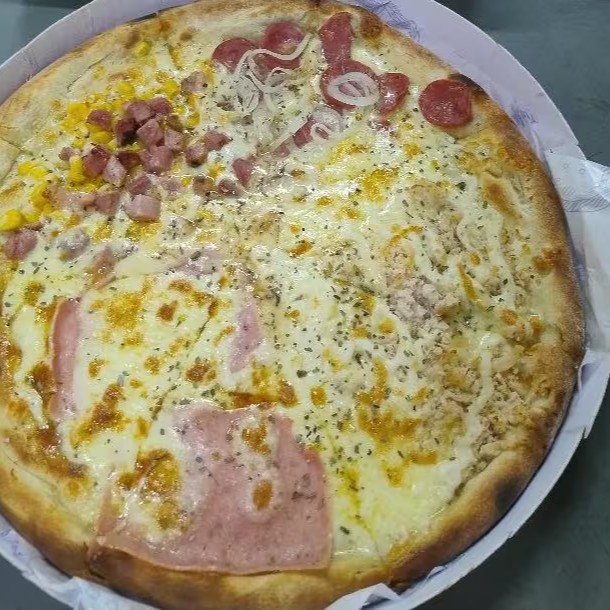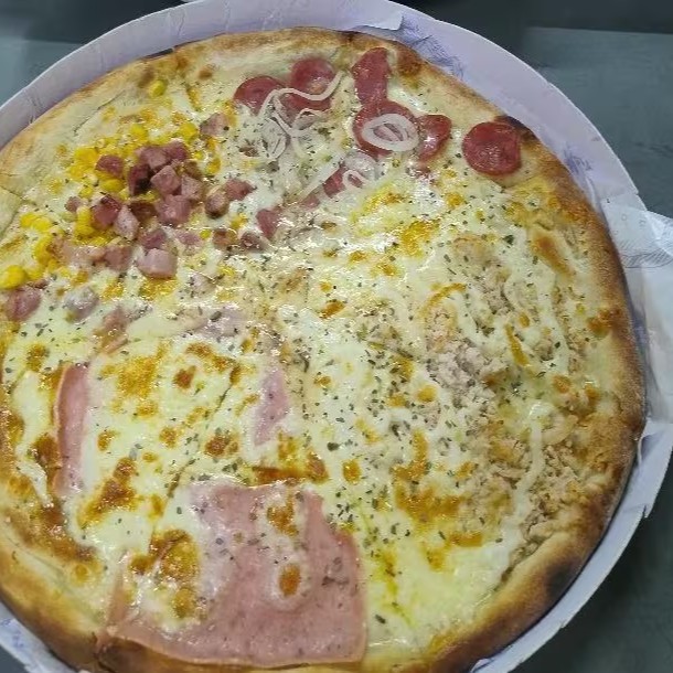 Delicie-se com a nossa exclusiva pizza de quatro sabores, cuidadosamente dividida em oito porções generosas. Experimente duas fatias recheadas com a autêntica calabresa italiana, outras duas fatias são repletas de suculento presunto de alta qualidade. Desfrute ainda de duas fatias saborosas de frango com catupiri, um queijo cremoso e adorado por todos. E para finalizar, duas fatias de bacon crocante, que adicionam um toque defumado à pizza. Acompanha um refrescante Mate couro de 1,5 litros, perfeito para equilibrar os sabores ricos e intensos da pizza. Um verdadeiro banquete para os amantes de pizza!