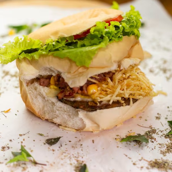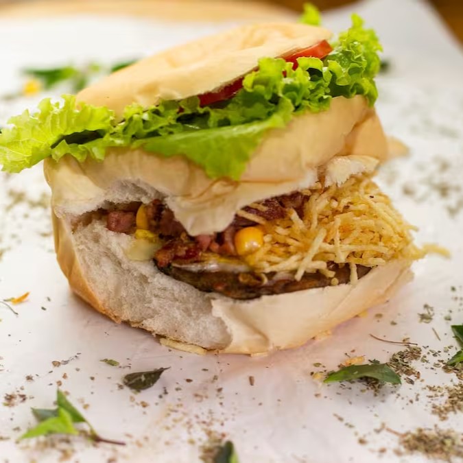 Pão, bife de frango, bacon, mussarela, presunto, Catupiry, ovo, alface, tomate, milho e batata