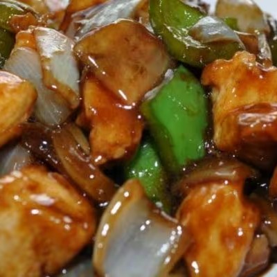 Aproximado: 400 g filé peito frango,400 g batata frita ,cebola e pimentão