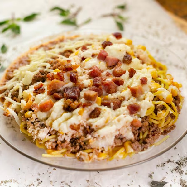 Espaguete, molho à bolonhesa, bacon, frango desfiado, molho, Catupiry e parmesão