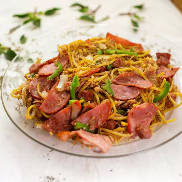 Macarrão, frango desfiado, bacon, calabresa, pimentão, cebola, molho shoyo, alho e mussarela.