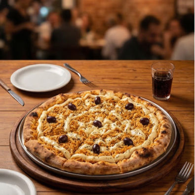 Massa, mussarela, frango desfiado, requeijão e orégano