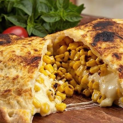 Massa leve e macia, recheada com uma combinação cremosa de mussarela derretida, grãos de milho doce e requeijão suave, tudo temperado com um toque aromático de orégano. Assado até dourar, esse calzone oferece uma experiência deliciosa e reconfortante, perfeita para quem busca sabores envolventes e aconchegantes!