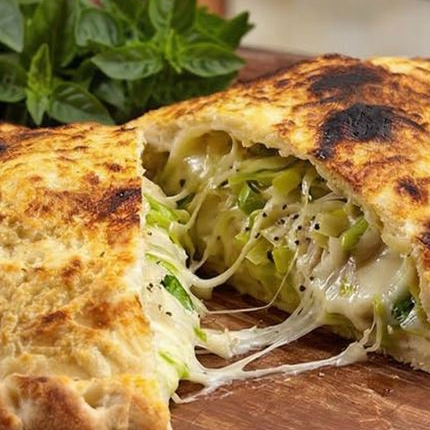 Massa leve e macia, recheada com uma mistura cremosa de mussarela derretida, alho-poró fresco e suavemente temperado com cream cheese, finalizada com um toque aromático de orégano. Assado até ficar dourado e crocante, esse calzone proporciona uma explosão de sabores delicados e uma textura irresistível, perfeito para uma refeição reconfortante!