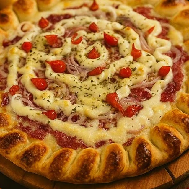 Muçarela,molho a bolonhesa,frango,massa especial.