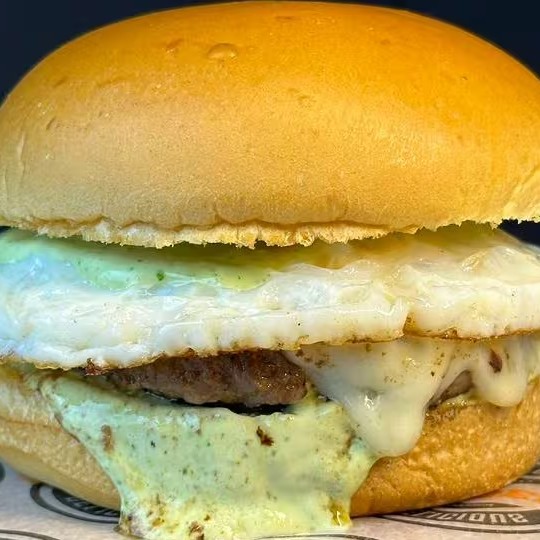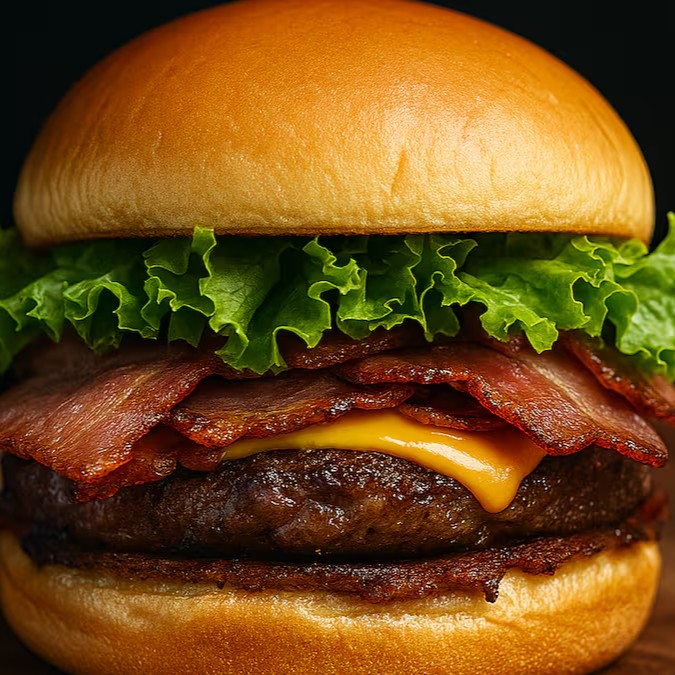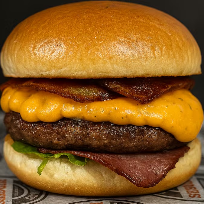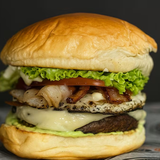 Uma deliciosa carne bovina de 150g,queijo prato ,bacon tomate e alface,maionese da casa.