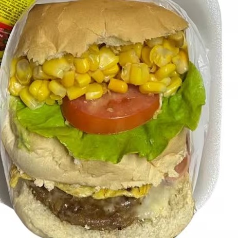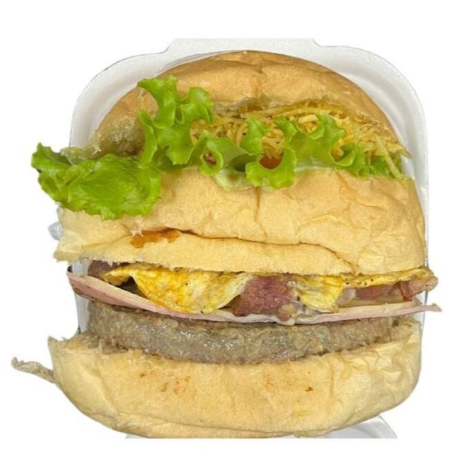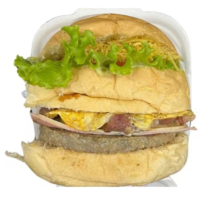 Pão, Hambúrguer de boi, Ovo, Bacon, Queijo, Presunto, Milho, Salada e Molho Especial