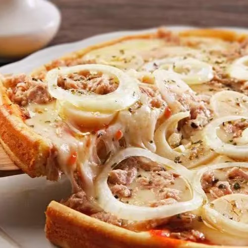 Pizza Artesanal, Base com Molho ao Sugo, Mussarela, Atum, cebola branca e Finaliza com Orégano.