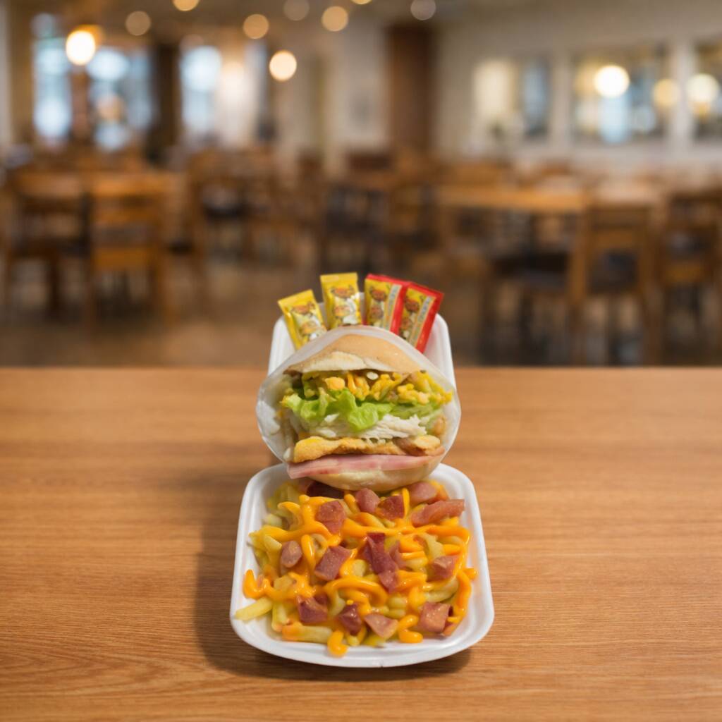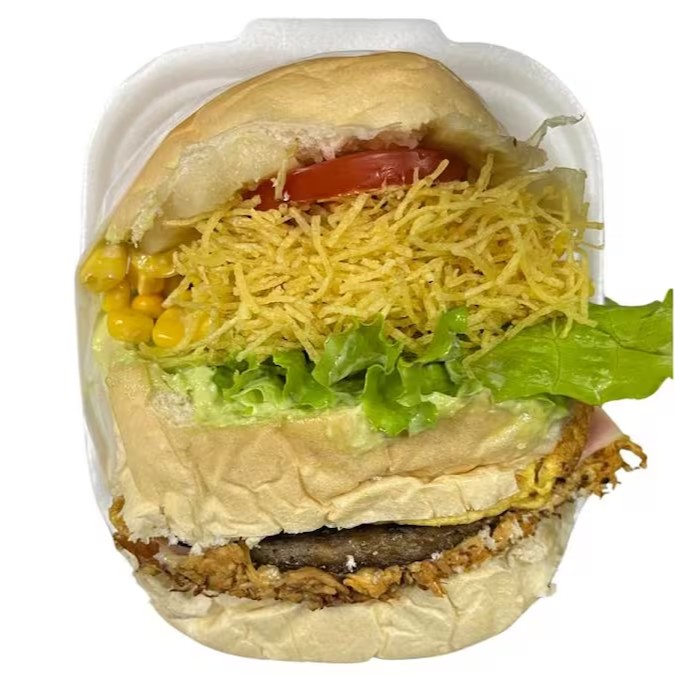 Pão, Hambúrguer de Picanha 120 gr, Frango desfiado, Ovo, Bacon, Catupiry, Queijo, Presunto, Milho, Batata Palha, Salada e Molho Especial.