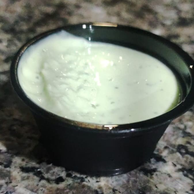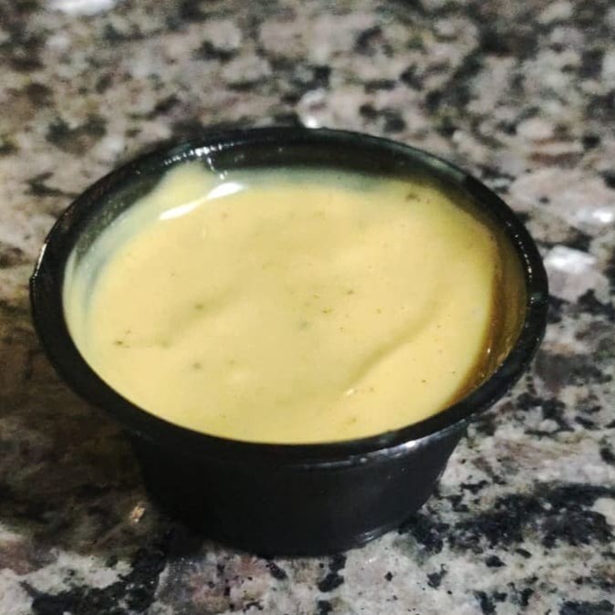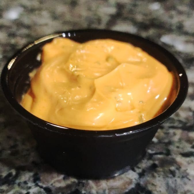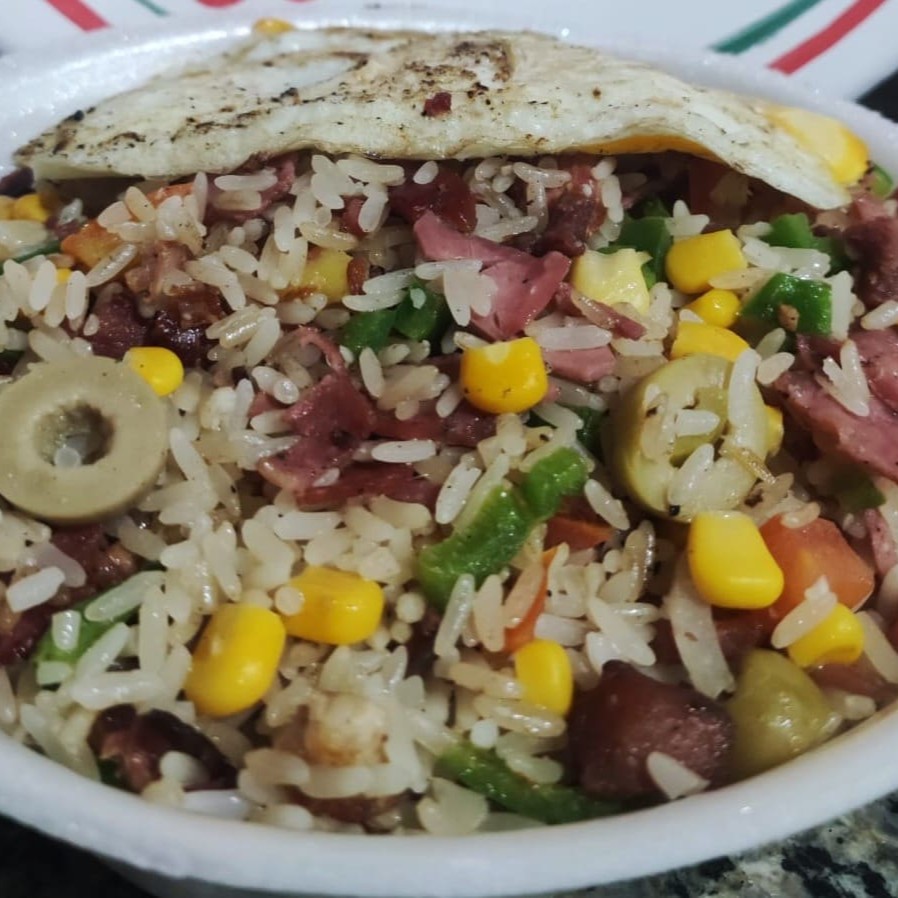 Arroz, calabresa, azeitona, cebola, pimentão, tomate, bacon, molho alho, milho e frango.