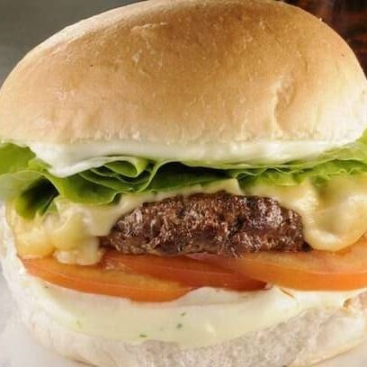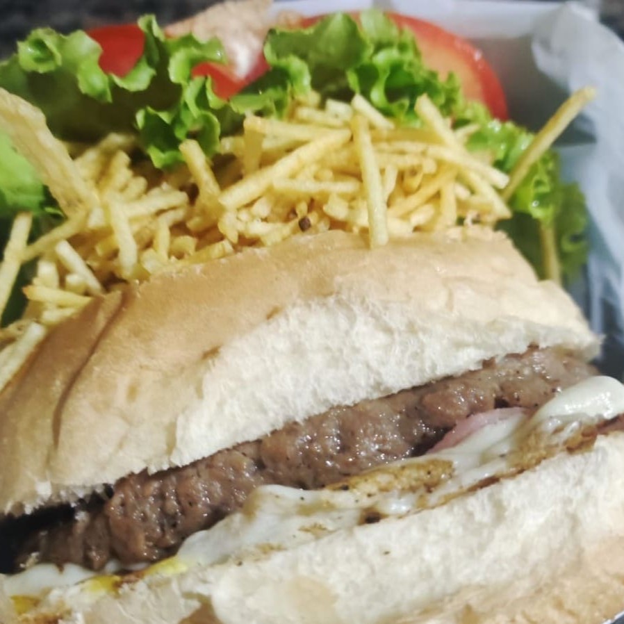 Pão, hambúrguer, mussarela, tomate, alface, milho, batata palha e maionese.