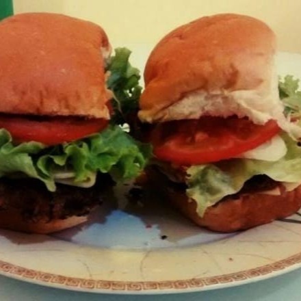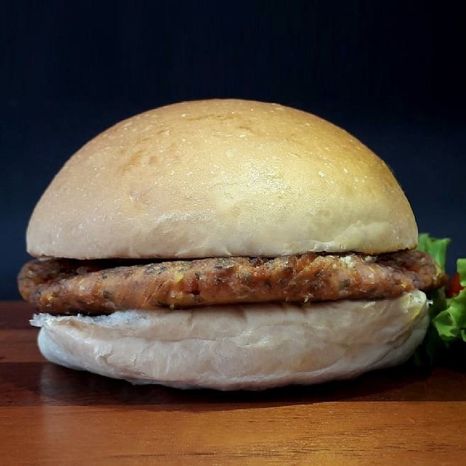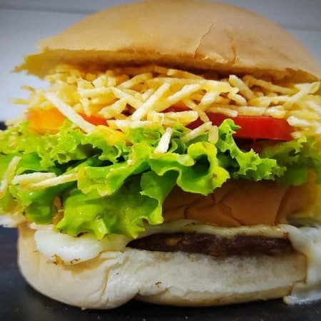 Pão, hambúrguer, tomate, alface, milho, batata palha e maionese.