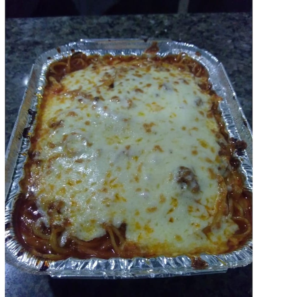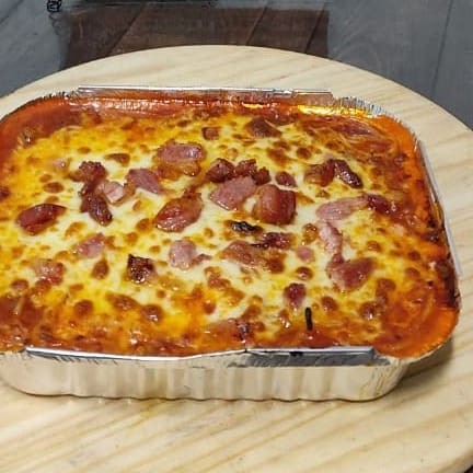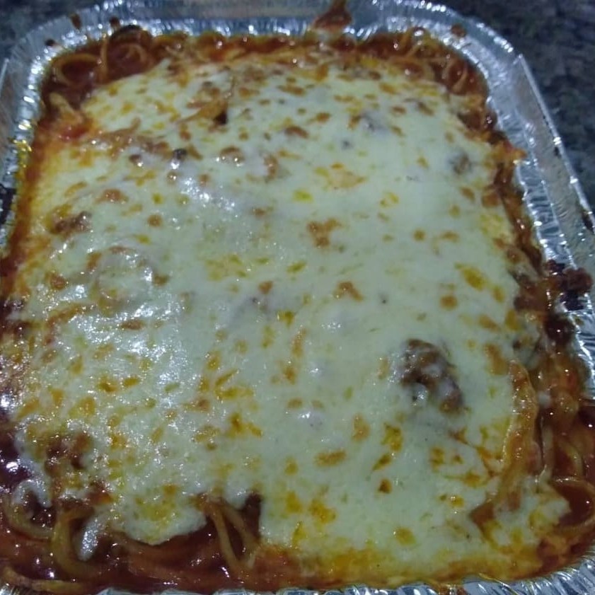 Macarrão, mussarela, creme de leite, presunto e molho bolonhesa.